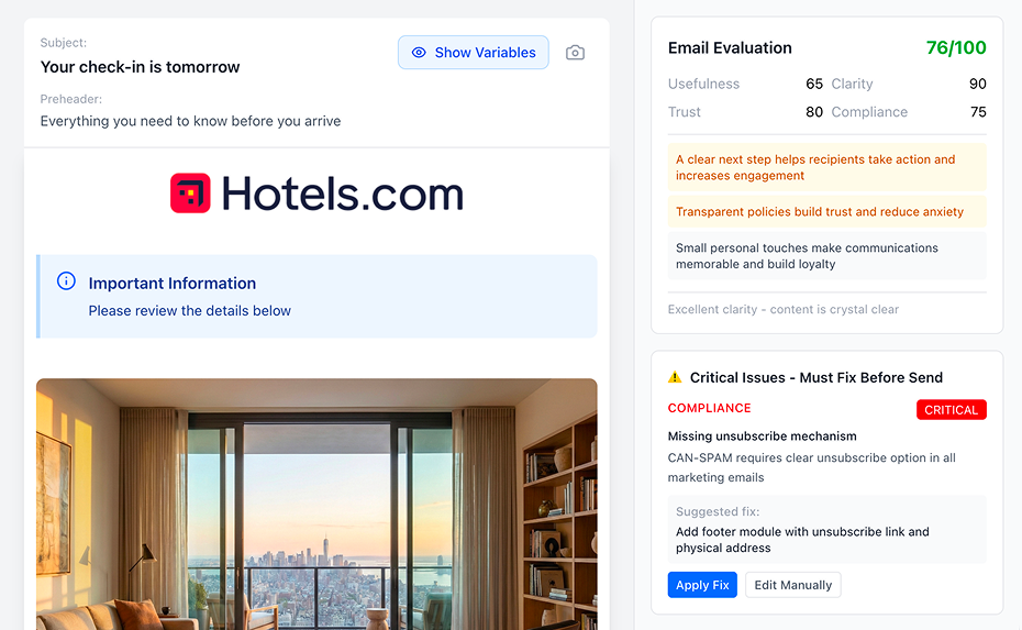 It shouldn’t take four to six weeks to send a customer email. But at enterprise scale, across multiple brands — Expedia, Hotels.com, Vrbo — with separate requirements for email, SMS, push notifications, and in-app messaging, that was the reality. The bulk of that time wasn’t spent making communications better. It was eaten by design reviews, legal sign-offs, compliance checks, and routing content to the right people in the right order. None of that overhead was creating value for the traveler on the other end.
